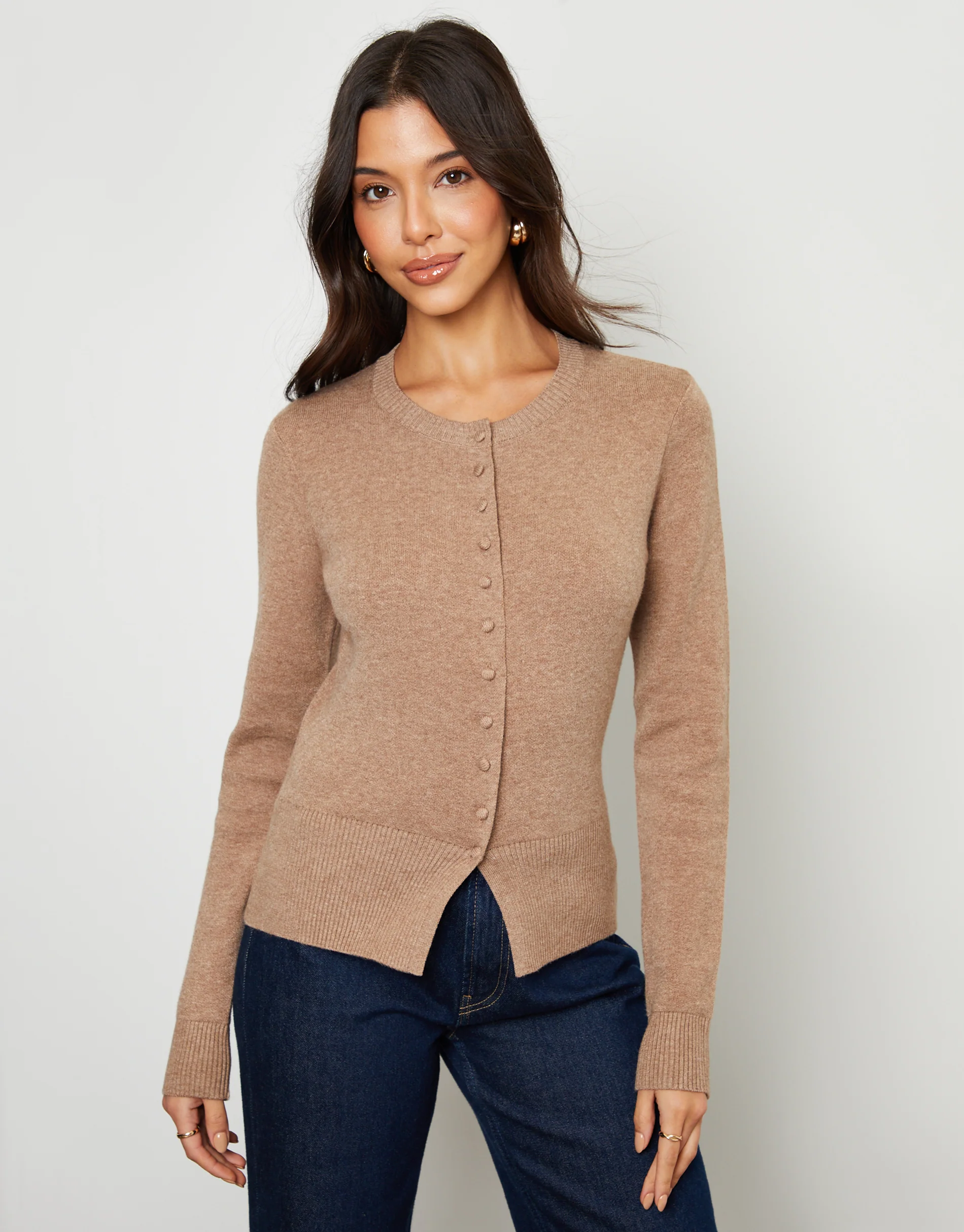 Classic Silhouette: Features a ribbed crew neck and a self-fabric covered button-through fastening that extends to the waist for a seamless, tonal look.
